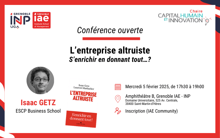 Isaac Getz, professeur à ESCP Business School, sera le mercredi 5 février 2025 à 17h30 l’invité de la Chaire Capital humain et innovation de Grenoble IAE - INP, UGA.